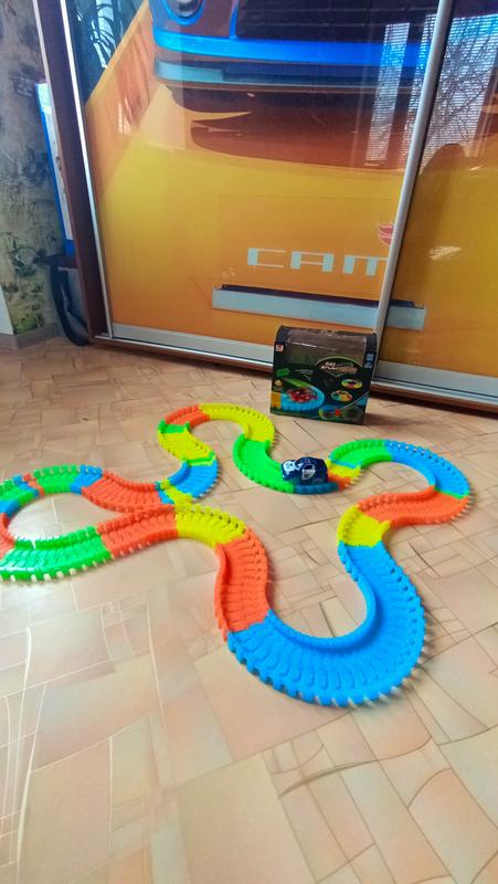 Стан НОВОГО,бо дитині не зайшов ,наразі інші інтереси ,лежить без діла.Автомобіль світиться - поліцейський .Гнучка гоночна траса з 223 деталей.Коли виключити світло ,то траса вся світиться від автомобіля ,дуже суперово для діток.