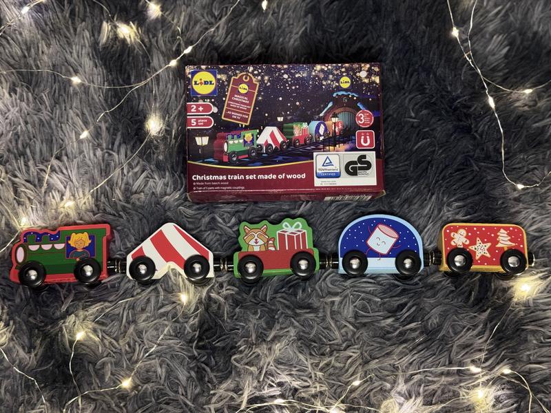 5 элементов: локоматив и 4 вагонов материал: натуральное дерево, покрытое безопасными красками вагоны скрепляются с помощью магнитов возраст: от 2 лет ширина одного вагончика приблизно 5 см