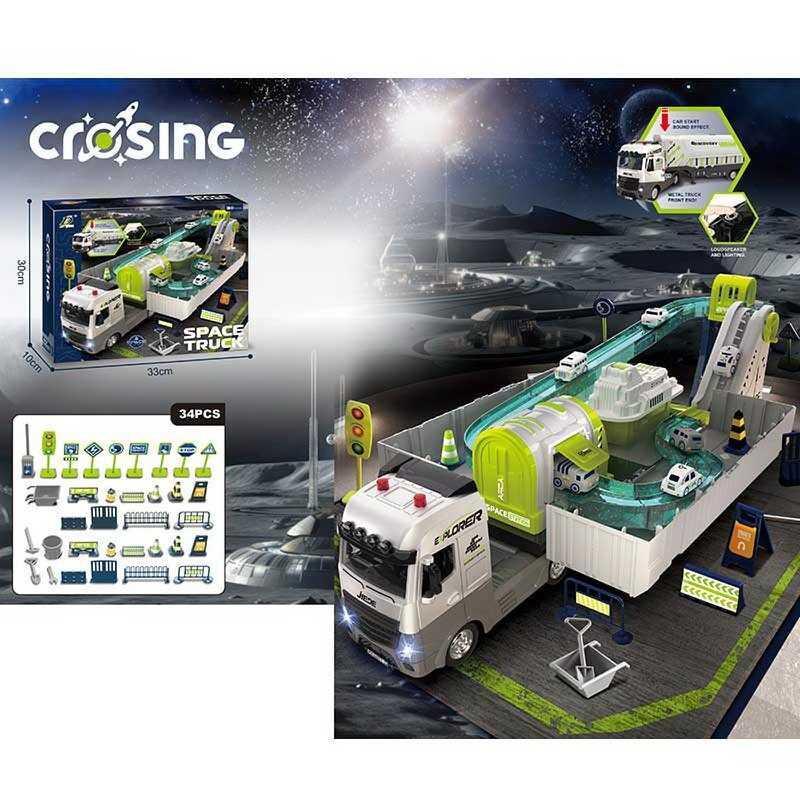 Уникальный космический трек для увлекательных игр Этот многофункциональный игровой набор сочетает большой грузовой трек с подсветкой, звуковыми эффектами и инерционным механизмом для машинок. Грузовик служит одновременно треком и укрытием для космической станции, которая разворачивается в большое замкнутое кольцо со спиральной трассой. Машинки могут беспрерывно двигаться благодаря механическому подъемнику, возвращающему их на стартовую позицию. Основные характеристики - Металлопластиковый корпус грузовика с открывающимися дверцами и детализированной кабиной - Резиновое покрытие на колесах для лучшего сцепления с поверхностью - Реалистичные звуки двигателя и подсветка фар - Инерционный механизм в колесах для плавного движения машинок - Механический подъемник для поднятия машинок на начало трассы - В комплекте 6 машинок для гонок - Декоративные элементы окружения и инструкция по сборке - Подсветка и звуки работают от батареек, входящих в комплект - Размеры грузовика в собранном виде: 40.5х7.5х13.5 см
