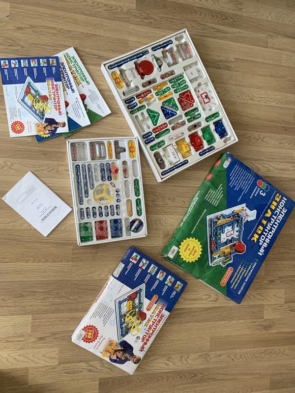 В конструкторах может не хватать нескольких деталей (в основном в маленьком) Есть инструкции Большой-2500 грн Маленький-500 грн Оба за-2700 Великолепная модель конструктора для вдумчивого малыша. Из предложенных материалов нужно составить электронную цепь. Подключаем батарейки и смотрим как она работает. Схема может светиться, звучать, играть. Всего в предложенном комплекте 999 вариантов различных схем и даже сборка собственного радиоприемника, диктофона и охранной сигнализации. Ребенок уже в юном возрасте познает основы физики, магнетизма, принципы действия электрического тока. Работает от четырех батареек АА (не входят в комплект). Мегапопулярная новинка, которая не оставит равнодушным вашего ребенка и надолго увлечет его внимание. ………………………………………………………………………………………………..