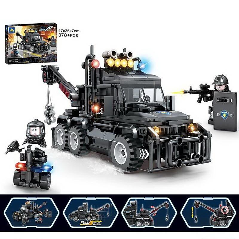 Современный и невероятно интересный конструктор серии "SWAT Force" демонстрирует будни полицейских, благодаря мощному спецавтомобилю, они могут справиться с любой задачей - автокран окрашен в черный цвет с надписью "Полиция"; - конструктор включает 2 фигурки полицейских, оснащенных щитами и оружием; - кран регулируется и крутится в разные стороны; - машинка оснащена инерционным механизмом; - в наборе также транспортное средство – сигвей -количество деталей 378+ -тип крепления пазовый
