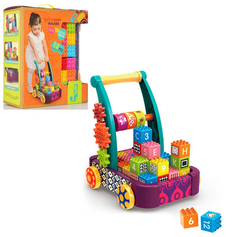 Конструктор каталка - уникальная игрушка, которая совмещает в себе тележку для перевозки и хранения игрушек, а также ходунки-каталку. Ручка каталки - идеальная опора при первых шагах ребенка. Таким образом, игрушка не только подарит увлекательную игру вашему малышу, но также поможет научиться ходить. Каталка на колесах имеет приятную расцветку и позволит собирать блоки с контрастными изображениями фигур и буквами. А также оборудована шестеренками, за работой которых малышу будет интересно наблюдать, и прокручивающимися элементы под ручкой с рисунками и буквами. В набор входит 12 крупных кубиков, идеально адаптированных для маленьких рук. Детали прочные и качественные, изготовлены из прочного и безопасного пластика. Легко собираются и разбираются. Высота от пола до ручки 43 см.