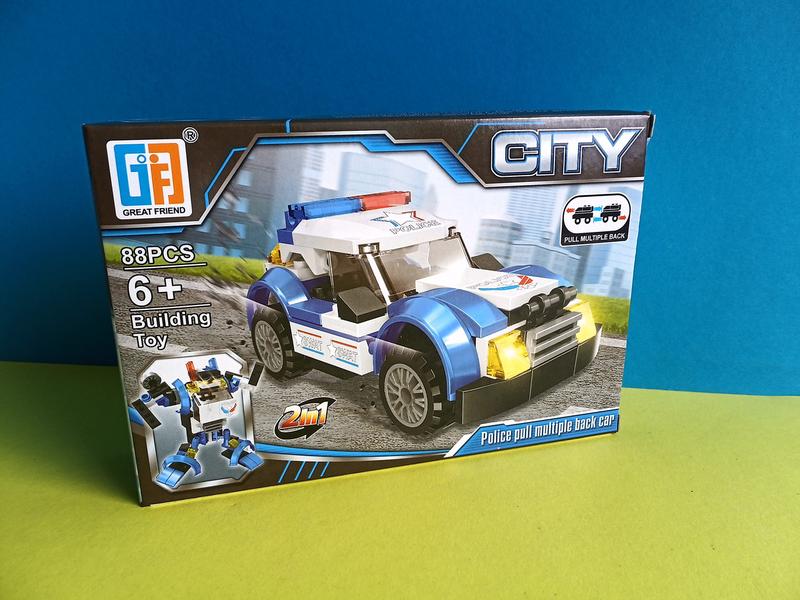 Конструктор Полицейский автомобиль с инерционным механизмом. Конструктор состоит из 88 деталей из которого можно собрать полицейскую машину или робота. В комплекте: - детали - инерционный механизм - наклейки - инструкция