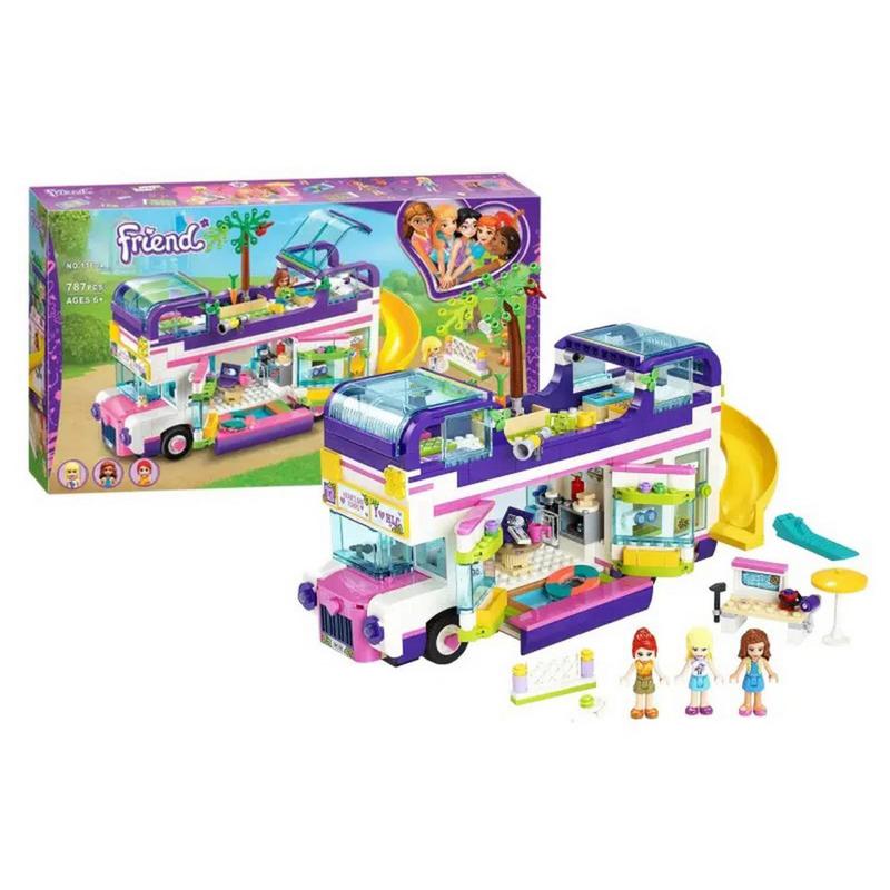 Конструктор Френдс Автобус для друзей. Непоседливые подруги Мия и Стефани обожают дальние путешествия и необычные маршруты. В своем ярком трейлере они могут проехать многие километры, если у них есть достаточно заманчивая цель. Машина девочек заслуживает отдельного упоминания – она очень вместительна, ее левый борт открывается, благодаря чему можно играть мини фигурками и в салоне машины. На крыше авто размещена зона отдыха, там же есть мини сад, плюс два спальных места. С правого борта есть дверь для входа в салон и окно с навесом, который можно убрать. Высокая проходимость обеспечена тремя парами колес.