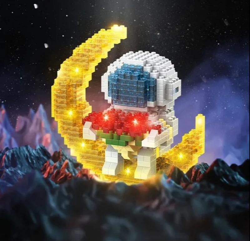 Конструктор с подсветкой астронавт на месяцы с цветами, лего пластик, игрушка космос, ночн...