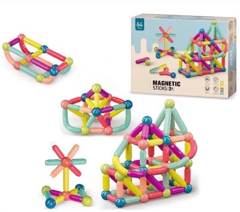 Магнитный конструктор Magnetic Sticks 64 детали - магнитный конструктор для самых маленьких. Он создан с учетом рекомендаций детских психологов и педагогов. Особенности: - Магнитный конструктор включается 64 разноцветных элемента различной формы. - Внутри корпуса из прочного пластика спрятаны и запаяны магниты, что обеспечивает надежность и безопасность. - Наличие магнитов создает постоянное притяжение и способствует хорошей фиксации. Преимущества: - наборы комбинируются между собой - закладываются навыки ролевой игры - компактные детали удобно помещаются в ручке ребенка; - свободное конструирование и комбинирование - ориентирован на развитие воображения, мелкой моторики, логического и пространственного мышления - красочная инструкция в комплекте содержит примеры конструкций.
