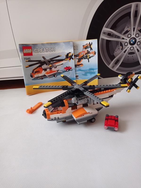 Конструктор LEGO Creator Транспортный вертолёт (7345) Очень большой (крупный) и красивый набор. Есть пару деталей, которые заменены по цвету. Состояние деталей отличное. Инструкции обе в наличии. Коробка отсутствует. Создай свой собственный транспортный вертолет! Благодаря набору Lego 7345 Creator ты сможешь собрать целых три транспортных средства: - большой транспортный вертолет, - гидросамолет и - паром. Вертолет имеет убирающиеся шасси, его задняя стенка откидывается и превращается в трап. Это позволят легко произвести загрузку груза. Твой мощный вертолет может перевозить даже автомобили. Если ты построишь гидросамолет с двумя винтами, то сможешь успешно сажать его на воду, а паромом можно будет перевозить людей и небольшие грузы сколько угодно раз – с острова на материк и обратно. Размеры вертолета – 28 см в длину, 9 см в ширину, 10 см в высоту. Размеры гидросамолета – 24 см в длину, 8 см в ширину и 24 см в высоту. Размеры парома – 17 см в длину, 7 см в ширину, 10 см в высоту.