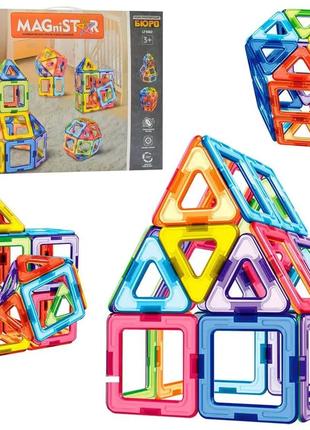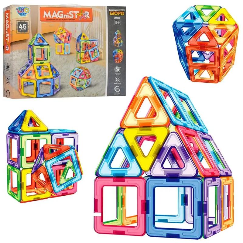 Конструктор магнитный, 46 деталей LT1002 Магнитный конструктор LT1002 46 деталей Magnistar Limo toy - интересный, качественный, яркий, необычный набор, станет интересным подарком для вашего ребенка. Игры с конструктором способствуют развитию мелкой моторики, креативности, цветового восприятия, воображения и логического мышления. Характеристики: Рекомендуемый возраст: от 3-х лет; Материал: пластик; Количество деталей: 46 (30 магнитных и 16 вспомогательных); Размеры упаковки: 35 х 28 х 6.5 см; Вес: 0.65 кг Комплектация: 46 деталей разной формы; подробная иллюстрированная инструкция; один стикер с самоклейками Особенности: Детали конструктора - это разноцветные, квадратные и треугольные со встроенными магнитами, а так же вспомогательные элементы без магнитов. Приблизите детали друг к другу, и они равномерно соединятся между собой, образуя плоские, правильные геометрические формы, а также объемные фигуры. Детали конструктора изготовлены из прочного, гладкого и абсолютно безопасного пластика, они не имеют мельчайших деталей и острых углов. Этот конструктор полностью совместим с конструкторами других марок.