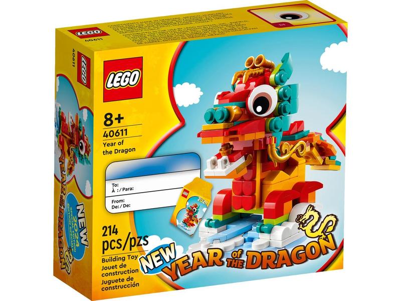 Отпразднуйте Лунный 2024 год с этим набором для строительства и декора LEGO Year of the Dragon (40611) для детей от восьми лет и старше. Модель дракона имеет культовые большие глаза и подвижный хвост. В комплект входит подставка с изображением неба и облаков и красный бумажный конверт, символизирующий пожелания. Этот забавный подарок на Лунный Новый год для всей семьи входит в коллекционную серию LEGO Zodiac Animals.