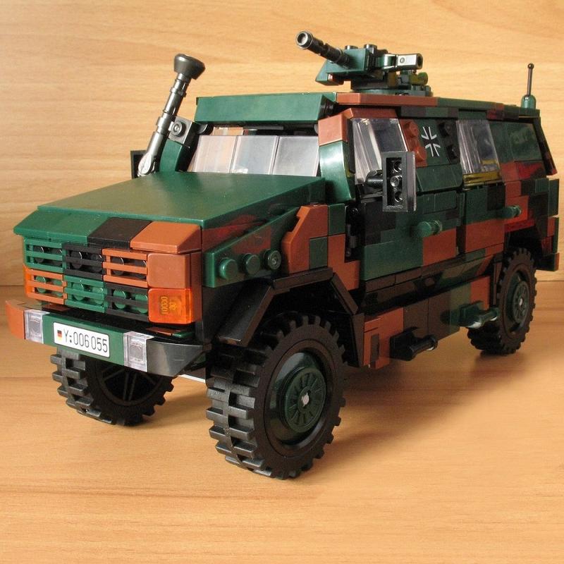 Конструктор XingBao очень погож на военную немецкую бронемашину - Dingo ATF это колесный, аэромобильный полностью защищенный бронеавтомобиль Бундесвера, предназначенный для патрулирования, разведки. Защита ATF Dingo должна выдержать взрывы мин, самодельных взрывных устройств, попадание из стрелкового оружия, обломков артиллерийских патронов, гранат. Выполнен он в масштабе 1:30. Набор состоит из 670 деталей. Размер собранной модели 22 * 11 * 12 см. Размер коробки 49 * 7 * 36 см.