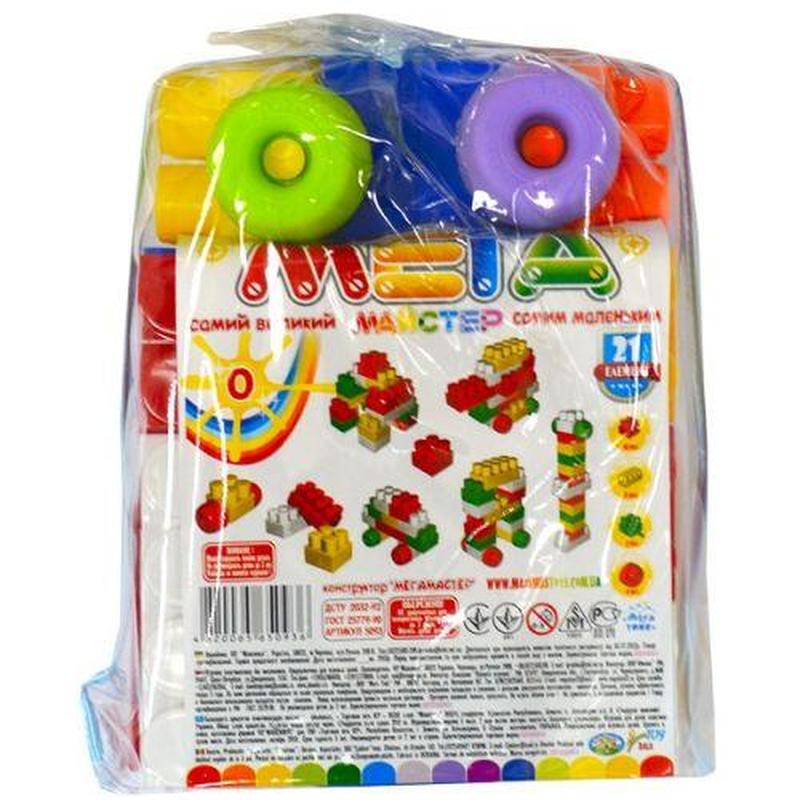 Конструктор "Мега Майстер 0", 21 элемент. Пластиковый конструктор с крупными деталями (квадратные 5 х 5 х 5 см, прямоугольные 5 х 5 х 11 см). В наборе есть детали с колесами, что позволит ребенку собрать разнообразные машинки и транспорт.