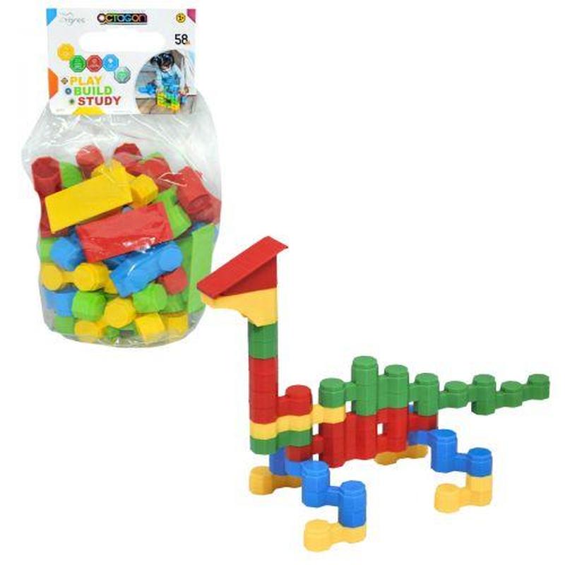 Пластиковый яркий конструктор. Большие детали, для детей от года. Есть детали для постройки домиков, зверей, интересных фигур и еще многих увлекательных вещей. Выполнено из качественного и прочного пластика. В наборе 58 элементов.