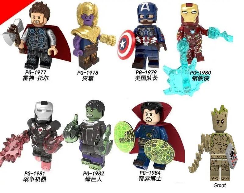 Набор из блоков состоит из 8-ми героев как на фото. Железный человек, Грут, Тор, Капитан Америка, Доктор Стрендж, Танос и другие. Каждый герой идёт в индивидуальном запаянном пакетике, без коробки. Для игры и для коллекции. Развивают мелкую моторику детей. Выполнены из ABS пластика. Все наборы совместимы с конструкторами других брендов.