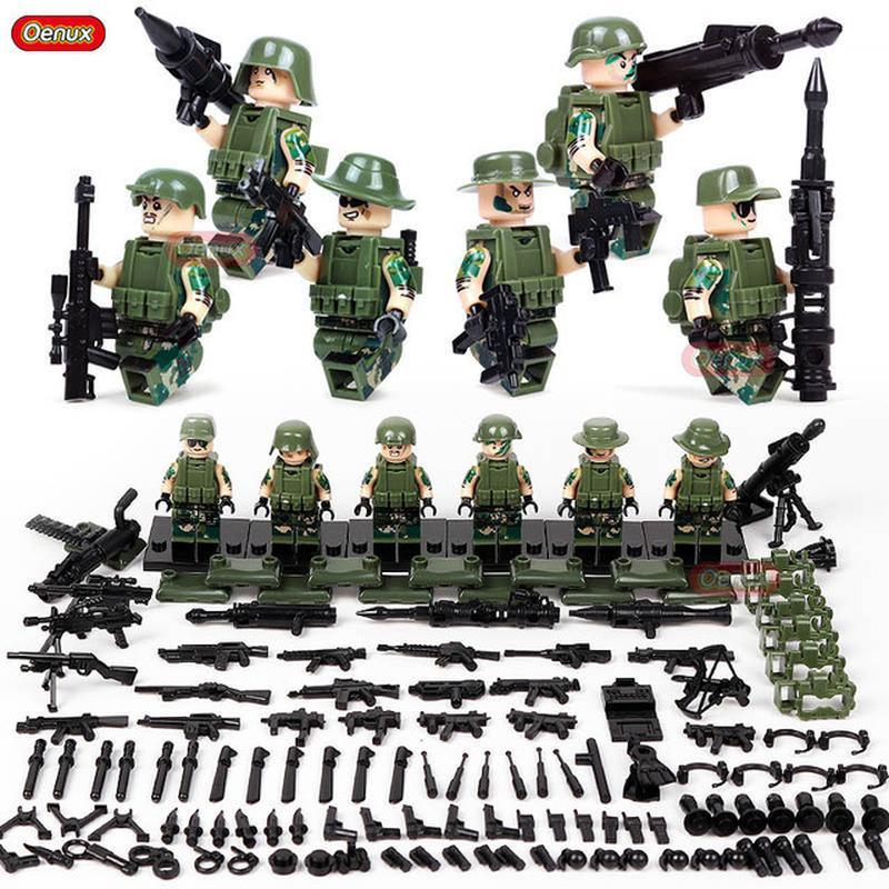 Набір із 6-ти фігурок військових та багато зброї та аксесуарів 150+, як на фото. Кожен герой йде в індивідуальному запаяному пакетику, без коробки. Для гри та для колекції. Розвивають дрібну моторику дітей. Країна виробник: Китай Вікова група: Від 3 років Матеріал: Пластик Стать: Для хлопчиків Стан: Новий Тематика: Військова техніка Тип конструктора: Блочний Упаковка: Поліетиленовий пакет Колір: Зелений