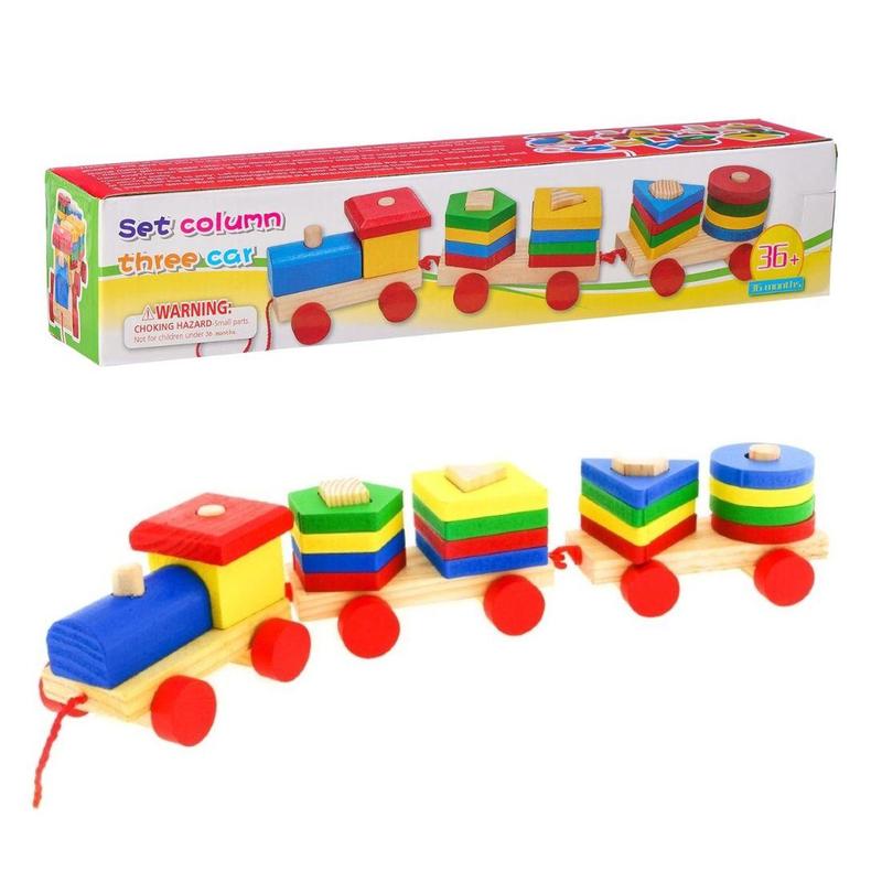 Сортер деревянный Поезд, 2 вагончика, фигурки разного цвета и формы.