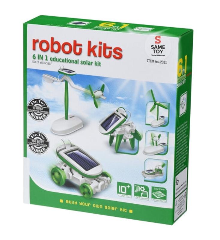Same Toy Солнцебот 6 в 1 Робот-конструктор Same Toy Солнцебот 6 в 1 на солнечной батарее - это прекрасная развивающая игрушка для Вашего ребенка. Из конструктора можно собрать шесть различных моделей. Все эти модели способны передвигаться, так как работают на солнечной энергии (от солнечных панелей). Для сборки не требуется никаких винтиков, отверток и прочих дополнительных инструментов - все уже есть в комплекте. Для удобства сборки рекомендуется использовать маленькие кусачки. Для нормальной работы игрушек требуется солнечная погода. Направленная на солнце панель принимает на себя солнечную энергию и преобразовывает ее в электрическую, заставляя вращаться двигатель. Все детали конструктора изготовлены из качественных материалов - пластик, металл, поликристаллические пластины, медные провода, пружинные механизмы. Даже родителям будет чем заняться и поиграть с ребенком. Такая игрушка развивает мелкую моторику ребенка, повышает его интеллект и учит альтернативным источникам энергии. Преимущества конструктора: - электромеханический конструктор увлечет Вашего малыша в технической сфере; - возможность создать до 6 различных моделей; - движущиеся модели питаются от солнечной энергии; - инструкция с картинками поможет Вам весело собирать модели; - игрушка-конструктор не только для малыша, то так же и для взрослого.