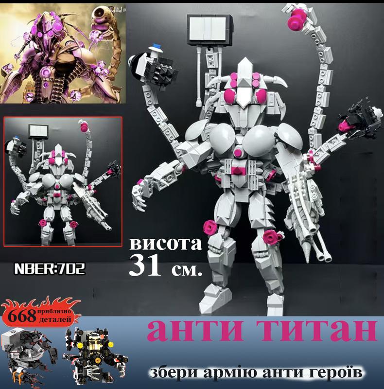 конструктор Анти Титан skibidi toilet, збирається з 668 деталей, має близько 310 мм висоти. Зібрані фігури мають рухливі елементи, і після складання можуть бути включені до подальших ігрових сюжетів. З конструктором Скібіді Туалет ви зможете втілити в життя захоплюючі пригоди та створити свої власні історії, беручи участь у боротьбі між Скібіді Туалетами та Агентами, а також додати елементи гумору до своєї колекції іграшок. набір є ідеальним подарунком для маленьких фанатів та молодих будівельників. У комплекті представлені докладні інструкції зі складання, які зроблять процес навчання цікавим та наочним. Тренд 2023: Найпопулярніший персонаж в унікальній інтерпретації. - -