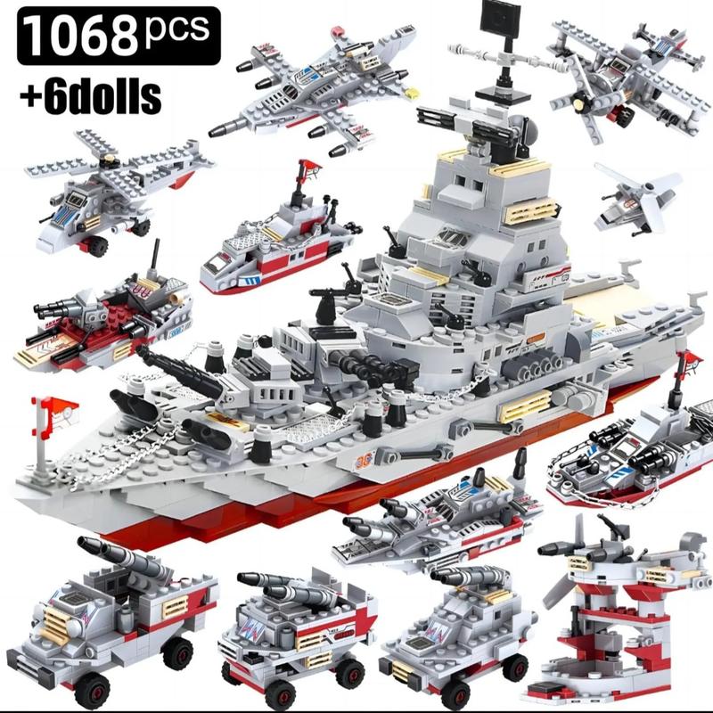 Конструктор военный корабль, имеющий в наборе 1068 деталей, подойдет для маленьких поклонников одержать победу в военных действиях. Здесь предоставлена возможность собрать огромное количество военной техники и разыграть настоящее поле битвы. Большое количество деталей в конструкторе позволяет собрать самолеты, танки, военные корабли и другую технику. Противоположность можно атаковать не только на суше, но и из воздуха, и даже в воде. С таким огромным арсеналом можно играть как самостоятельно, так и с друзьями или родителями. А совместимость деталей с конструкторами мировых брендов в виде LEGO позволит увеличить и разнообразить военный транспорт.Конструктор, предназначенный для детей в возрасте от 6 лет, изготовленный из экологически чистого прочного пластика. Все детали хорошо крепятся между собой, делая собранные модели надежными во время игры. Ребенок не только получает удовольствие от игры, но и развивает творческое, логическое и образное мышление, тренирует усидчивость и мелкую моторику рук.
