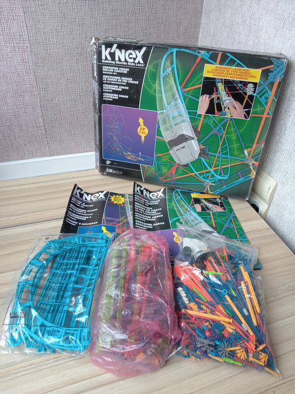 Конструктор K'Nex "Безумные гонки". Количество элементов: 536 деталей. Для детей от 9 лет Высота готового трека около 90 см. В длину 1.1 м. Есть инструкция. Синие детали еще упакованы, но не хватает нескольких деталей (детали таковы, но не в том количестве, которое указано в инструкции). í можно сложить и без них. Еще дополнительно есть детали и инструкция из другого набора похожего набора. Цена одного нового набора на сайтах от 1200. Цена: 700 грн