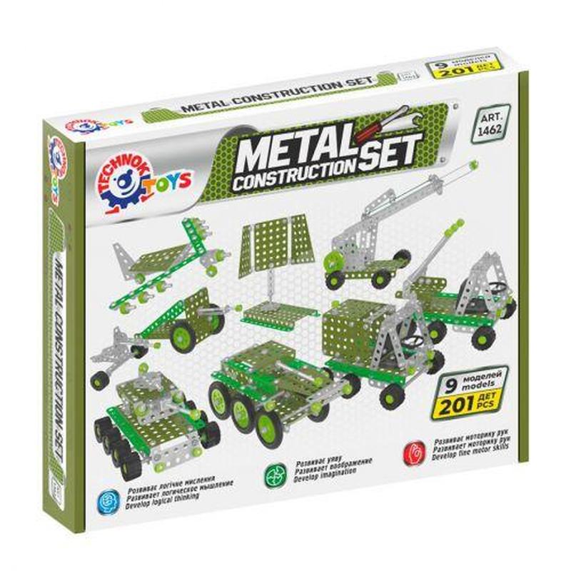 Конструктор металевий "Військова техніка". 201 деталь в комплекті (гвинтики, планки, гайки, вилки, кермо, колеса, ключі, викрутка і ін.). 8 різних моделей для збирання, інструкція. Бренд: Технок Упаковка: Коробка Колір: Різнобарв'я Вага з упаковкою: 875 г Габарити в упаковці: 30 x 4.5 x 25 см Габарити без упаковки: 30 x 5 x 25 см Країна виробник: Україна Матеріал: Метал,пластик Комплектація: 201 елемент, інструкція