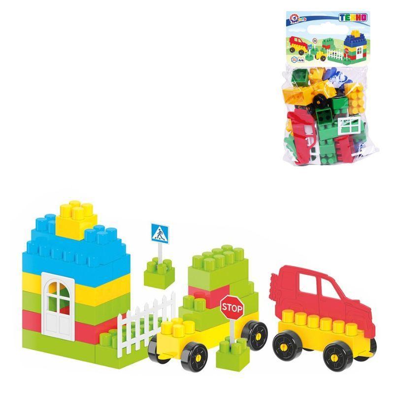 В наборе 44 интересных разнообразных деталей яркого классического цвета. Кирпичи разных размеров, окошки, двери и заборы для строительства домиков и замков. Набор дорожных знаков, фигуры машинок и самолета пригодятся для игр с гаражами и паркингами. Платформы с колесами – вообще находка. Можно построить автомобиль, поезд или самолет. А еще платформа пригодится при конструировании роботов.