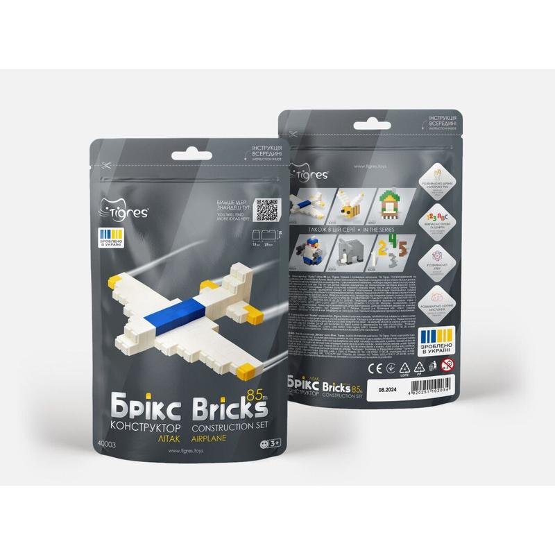 Конструктор "Брікс" літак 85 ел.,Tigres - унікальна новинка від ТМ Тигрес! Вікові обмеження 3+ Іграшка складається з 85ти одинарних та подвійних цеглинок різних кольорів. Розмір одинарних блоків - 13х13х16мм, подвійних -13х26х16мм. Кількість одинарних та подвійних блоків - відповідно до кожного дизайну + пару запасних елементів. За допомогою детальної покрокової інструкції, малюк може скласти літачок, а також має нагоду втілити безліч креативних ідей, використовуючи той самий конструктор. В серії "Брікс" 85 ел. - 6 різних кольорових наборів на будь-які вподобання хлопчиків та дівчаток - літак, дроїд, слон, бджола, будинок і цифри. Один набір дозволяє скласти 1 відповідний дизайн. Конструктор Брікс - функціональна іграшка, що сприяє розвитку дрібної моторики, фантазії, координації рухів, інтелекту, пам'яті та уваги. Конструктор виготовлений з безпечного матеріалу- поліпропілену, відповідає українським та європейським стандартам якості, про що свідчать відповідні знаки на етикетці. Упаковка - Дой-пак із застібкою для зручного зберігання іграшки.