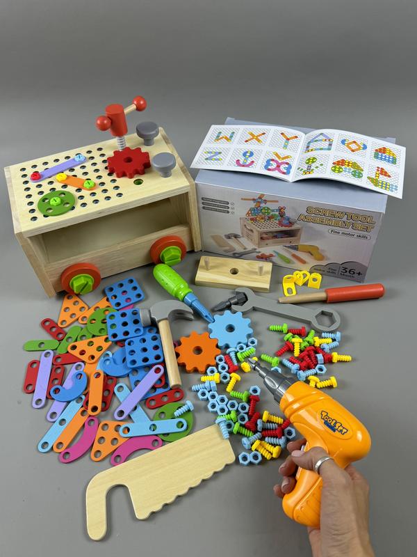 Интересный набор инструментов, который предназначен для развития мелкой моторики рук маленьких мастеров! Чего здесь только не найдешь: главные инструменты столяра, шурупы с гайками, удобный ящик для хранения инструментов, который также может выполнять роль столярного верстака. Прикрутите к ящику колесики, которые идут в комплекте, и получите тематическую каталку. Игровой набор познакомит мальчика с миром инструментов и принципом их работы, позволит сразу применить на практике полученные знания и закрутить свой первый шуруп! Особенности: - 3 в1: ящик с инструментами, столярный верстак и каталка; - набор инструментов включает: поворотный зажим гаечный ключ пилу молоток отвертку - комплект шурупов с гайками; - цветные шестерни; - элементы конструктора и мозаики с креплением (шурупы и гайки); - дополнительные отвертка и шуруповерт для работы с конструктором; - 4 колеса, которые превратят ящик в тематическую каталку; - шуруповерт работает от 2 батареек типа ААА (в комплект не входят); - книжечка с заданиями; - набор выполнен из натуральной древесины.