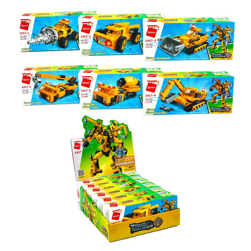 Конструктор Qman "Будівельна техніка". 6 видів, від 70 до 90 деталей. Матеріал - пластик. Упаковка - дисплей, 6 шт. Розмір - 28,5х10х22,5 см.
