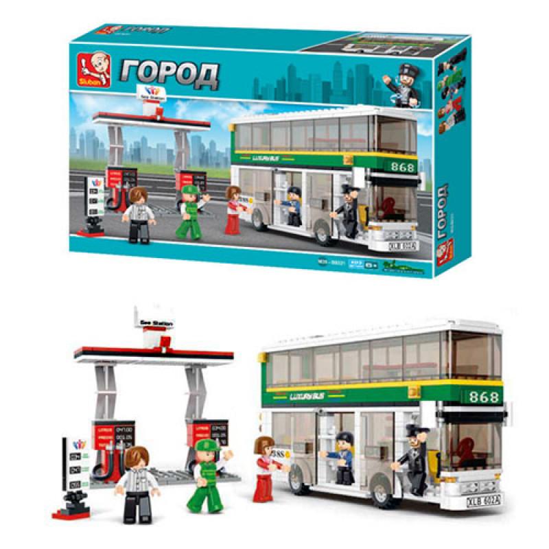 Конструктор SLUBAN M38-B0331 "Місто": двоповерховий автобус, фігурка, 403 дет. У комплект Конструктора Sluban "Двоповерховий автобус" входить заправна станція, з двома автоколонками, табло на підніжці з цінами на пальне та фігурка заправника. Двері автобуса відчиняються, а другий поверх автобуса з великими вікнами. Розмір коробки, см: 47,5 х 28,5 х 7 Кількість деталей: 403 шт