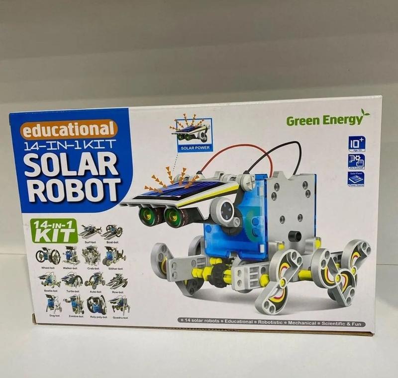 Конструктор Sollar Robot робот 1️⃣4️⃣ в 1️<unk> - конструктор из которого можно сложить 14 различных моделей 🤖 Собранные модели приводятся в движение двигателями, которые питаются от солнечных панелей 🔋 Такой конструктор подходит как для новичков, так и для опытных роботостроителей 🔩 Может использоваться для обучения, хобби, моделирования, а также как элемент декора или развивающая игра 👍 Работы, собранные из конструктора, выполняют различные комические и функциональные движения, такие как выляивание хвостом собаки-бота, похода жука, скольжение, гребля и т.д. 🤩 Солнечная батарея наиболее эффективно работает при ярком солнечном свете ☀️ В помещении в качестве источника световой энергии также можно использовать галогенную лампу мощностью не менее 100 Вт.💡 Виды роботов: 🤖 ✅ Робот-черепаха 🐢 ✅ Шагающий робот🚶 ✅ Робот на 4 ногах (квадробот) 🈁 ✅ Робот на колесах ⚙️ ✅ Робот-човен🛥 ✅ Робот-жук 🪲 ✅ Робот-собака 🐕 ✅ Робот-автомобиль 🚙 ✅ Робот-краб 🦀 ✅ Робот ползает 🐍 ✅ Робот-неваляшка🪆 ✅ Робот- зомби 🧟♂️ ✅ Робот-серфер 🏄 ✅ Весуровальный робот 🛶
