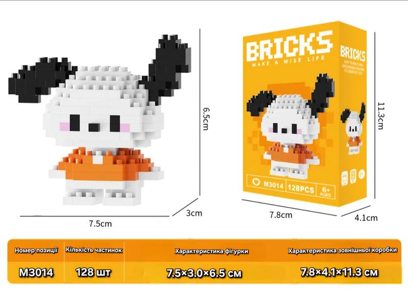 Конструктор "Bricks M3000" Возраст: от 6 лет. Размеры фигурки: 7.5 × 3.0 × 8.0см. Размеры упаковки: 7.8 × 4.1 × 11.3 см. Описание: Набор конструктора "Bricks M300" позволяет создать милую фигурку в виде мультяшного персонажа. Этот набор состоит из деталей, которые помогут развить внимание, воображение и мелкую моторику у ребенка. Особенности: Простой в сборке, подходит для детей и взрослых. Изготовлен из качественного пластика, безопасного для детей. Компактный размер готовой фигурки идеально подходит для коллекции или декора. Этот набор станет отличным подарком для детей, которые любят творческие задания и конструирование!