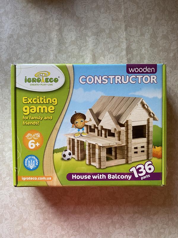Конструктор "Домик с балконом" — очень интересный и многофункциональный конструктор, который, по желанию малыша, может стать уютным домом для любимой игрушки, или трансформироваться в самолет, грузовик и т.д. Игрушка "Домик с балконом" является натуральной, экологичной, безопасной, не содержит вредных примесей. Конструктор изготовлен из дуба. Детали тщательно отшлифованы и ничем не покрыты. Все деревянные конструкторы компании Игротеко совместимы между собой и взаимодополняются. Состоит из 136 частей. Упаковка нова, запакована. Тільки целофанова упаковка трошки порвана (на фото видно).