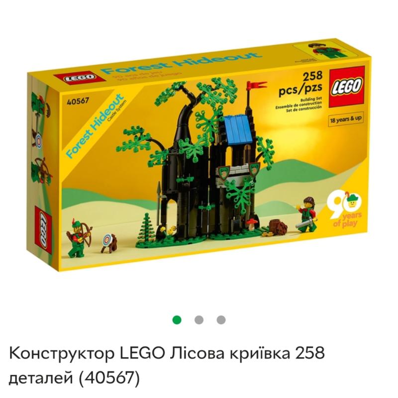 Идеальное состояние, один раз сложились. Самый нежный GwP в 2022 году! Ремейк набора 6054 из серии Castle 1988 года! Сентиментальный набор LEGO 40567 «Лесное спрятание» перенесет вас в конец 1980-х годов и подарит много незабываемых воспоминаний. Набор вышел в лимитированом тираже поэтому со временем его цена будет только расти. Идеально подходит к новому Лего Замку :) Набор LEGO "Лесная кроевка" продолжает одну из первых серий конструктора и посвящен его 90-летию. В нем можно собрать одно из хранилищ Лесных стражей, которые населяют окрестности королевства. На официальном сайте купить его просто так невозможно, он разрабатывался лишь ограниченное количество дней и в подарок к покупке от 150 долларов. О наборе Основная информация. Набор LEGO 40567 был выпущен в рамках серии LEGO Castle. Он включает 258 качественных деталей, красочную инструкцию (есть также доступ к электронным инструкциям в приложении LEGO Building Instructions) и рассчитан от 18 лет. Тематика набора – здание. Особенности серии. Серия Castle переносит фанатов конструктора в средневековый мир, где рыцари сражаются с драконами, а в лесу можно нарваться на разбойников. Она стала одной из первых в арсенале конструктора и до сих пор радует приключениями в замках и на окраинах. Фигурки стражей Набор включает 2 минифигурки, которые относятся к фракции Лесных стражей. Среди них: мужчина. Первый из разбойников облачен в красную кофту и зеленый костюм со следами потертостей, на голове – зеленая шляпа с красным пером. К его спине можно прикрепить сагайдик со стрелами, а получив лук, можно попробовать поцеловать в мишень; женщина. Вторая фигурка представлена разбойницей, которая имеет такой же наряд, как и муж. Однако вместо шляпы у нее волосы, а из оружия - меч. Обе фигурки имеют печать спереди и сзади туловища. Среди их аксессуаров: лук и сагайдидак со стрелами, 2 меча, копье и 2 щита с оленями. Некоторые из них сразу выдаются стражем, другие находятся в разных местах дерева. Крыльялка Стражей Укрытия в наборе LEGO 40567 представлена пустым деревом с красным флагом наверху. Сборка достаточно простая, большая часть приюта сделана из сложенных друг на друга кирпичиков и пластин. Листья встроены прямо в ствол дерева для большей устойчивости. Первый вариант такого был создан еще в далеких 1980-х, а теперь он получил обновленную версию. По сравнению со старым конструктором, новые элементы делают дерево более органическим и менее блочным, а новые техники дарят уникальный опыт сборки. Завершенная модель примудряется чувствовать себя как ретро, так и обновленной одновременно, что оценят как те, кто собирал первые наборы, так и те, кто только познакомился с серией. Попасть внутрь можно с помощью скрытых дверей, закрепленных на шарнирах. Синяя крыша приюта крепится зажимами и легко открывается, открывая другой способ входа. Таким образом, можно получить игровой доступ к внутренней части дерева. Он состоит из двух уровней, соединенных лестницей. Это не полноценный дом, поскольку в нем нет достаточно места и условий для жизни. Вместо этого приют выполняет роль смотровой башни и места, где хранятся сокровища. Именно на втором этаже можно найти бочку, наполненную золотом. Почувствуйте себя в роли Лесного стража, который только вернулся в форт, чтобы спрятать золото и посмотреть, не преследует ли никто его с набором LEGO “Лесная крыльца”. Удачной 