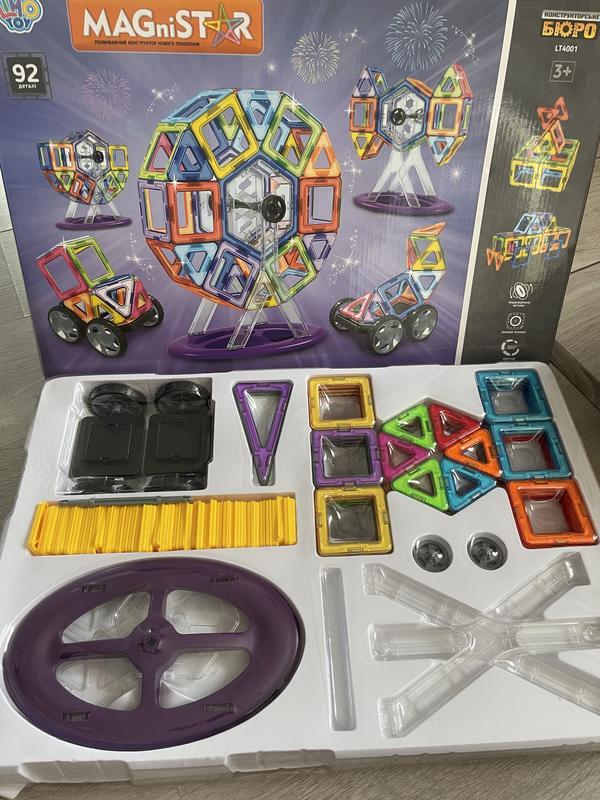 Конструктор состоит из 92 деталей – это разнообразные геометрические фигуры разных цветов и форм с магнитными краями, из которых можно собрать постройки, животных и абстрактные узоры. Магниты внутри свободно вращаются, всегда возвращаясь друг к другу нужным полюсом, что обеспечивает притяжение всех деталей. В наборе есть платформа для сборки колеса обзора. Рекомендуемый возраст от 3 лет можно использовать с более маленькими детьми, но при этом требуется наблюдение взрослых, чтобы избежать попадания мелких деталей в рот. Все детали изготовлены из качественного пластика с обработанными углами, поэтому царапины и порезы во время игры исключены! Особенности набора: - Магниты соединяют элементы конструктора без использования креплений; для держания пальцами, с обтекаемыми формами; - Возможность комбинировать с другими конструкторами этой серии.