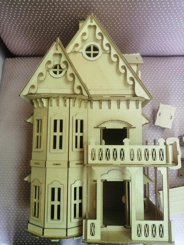 Кукольный игровой разборной дом из фанеры размерами 50х30х18 см двухэтажный экерный с мансардой и террасами. Экологичный (не вредный для ребенка) материал. Можно раскрашивать в свои цвета. Ребенку будет чем заняться :)
