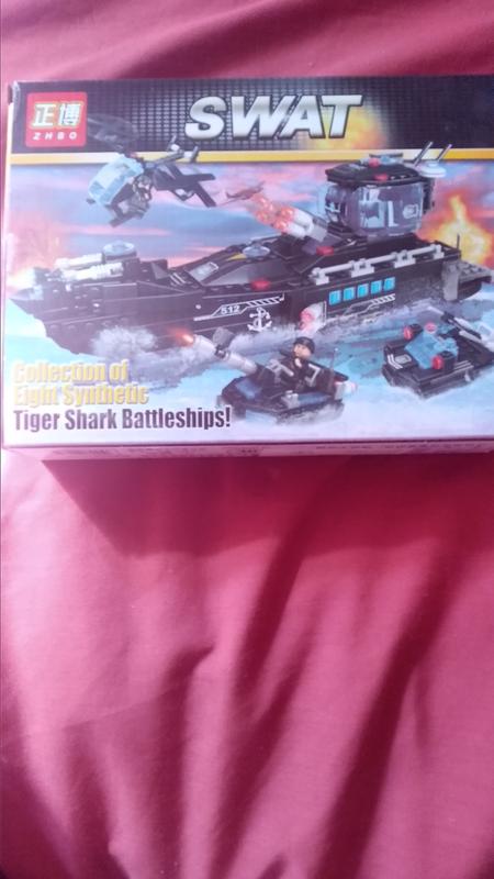 набор конструктора ZHBO "SWAT: Transport Rubber Boat". Набор предназначен для детей в возрасте от 6 лет. Содержит 92 детали. Номер модели: ZB320-1. Представляет собой конструктор, из которого собирается лодка и фигурка в стиле спецназа SWAT.