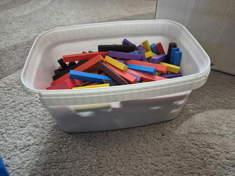 Конструктор состоит из деревянных брусочков разной толщины величины длины, ребенок может строить что угодно, развивает мелкую моторику. Коробка поровалась.