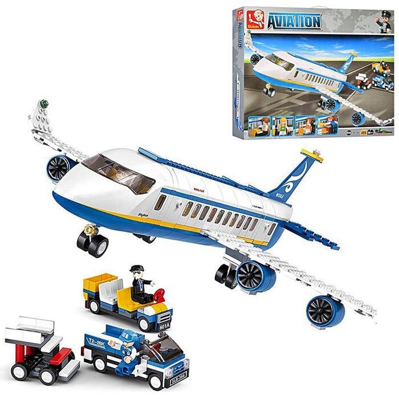 Конструктор Авиация SLUBAN 0366 состоит из 463 деталей сборки. В наборе есть все необходимое, чтобы собрать пассажирский самолет из шасси и двигателем. Длина самолета 43 см. Кроме того, в наборе есть грузовые машинки и фигурки рабочих. В наборе есть детальная инструкция.