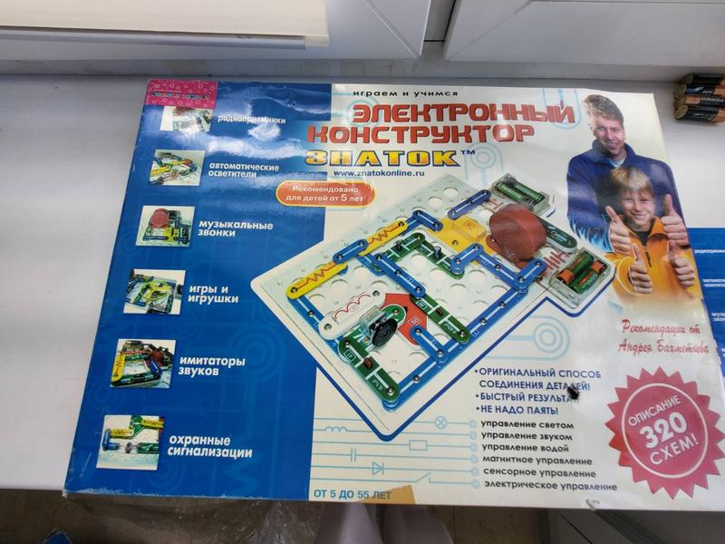 Конструктор Знаменец позволит ребенку почувствовать себя настоящим физиком. Играя, малыш будет учиться создавать радиоприемники, музыкальные звонки, имитаторы звуков, охранные сигнализации, автоматические осветители, а также различные логические элементы. В набор входят электронные блоки и разной длины провода, на каждом из которых есть номер в рамке. В помощь маленькому физику прилагается инструкция со 136 цветными иллюстрациями и описаниями 320 схем. Крепление деталей между собой не требует пайки, благодаря чему игра полностью безопасна для ребенка. Рекомендован для детей от 5 лет. Размер коробки – 35х48х6Конструктор электроник, в идеальном состоянии. Есть коробка.