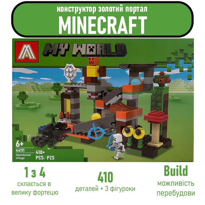 Конструктор minecraft золотой портал майнкрафт +3 фигурки+набор оружия 410 деталей в подар...