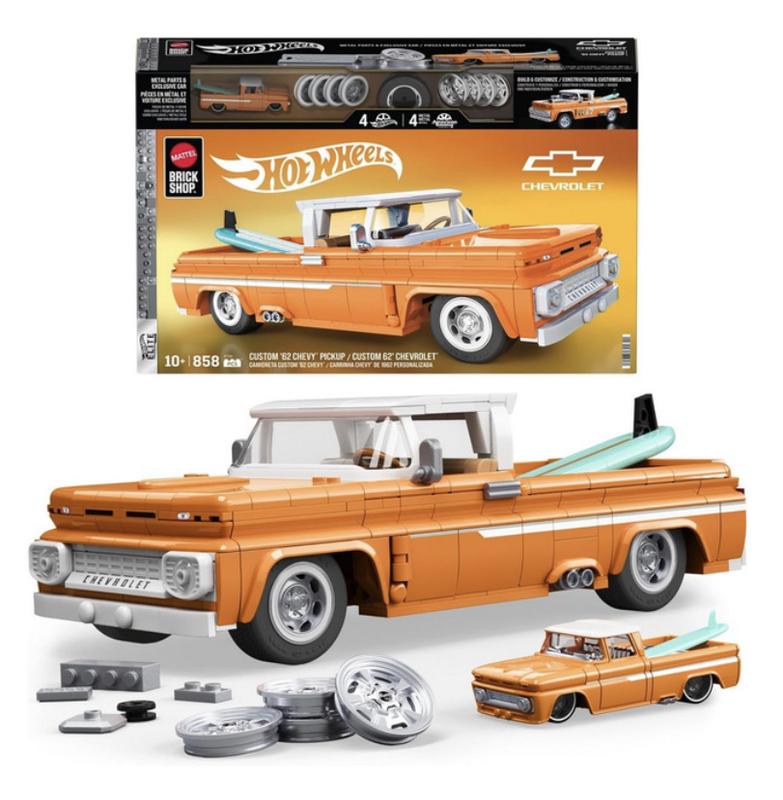 Конструктор Hot Wheels Brick Shop Elite Custom ’62 Chevy Pickup — збірна модель автомобіля у масштабі 1:16. Цей набір — справжнє втілення американської класики. Відкривні дверцята, регульована підвіска та серфборд у кузові надають моделі характеру. У комплекті: додаткові деталі для кастомізації (зокрема відкритий двигун), набір наліпок, металеві диски, фірмова металева табличка та ексклюзивна машинка у масштабі 1:64 для поповнення колекції та демонстрації. Деталі поєднуються з конструкторами Brick Shop та іншими популярними брендами.