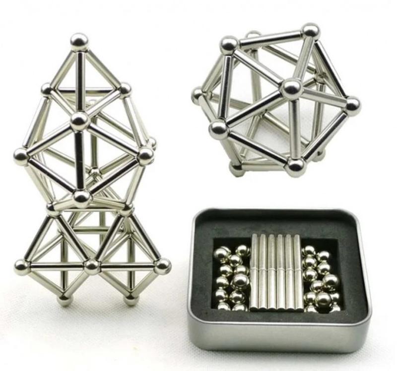 Магнитный конструктор Buckyballs & Buckybars (варианты названия - Бакибарс, мастер неокуб) - это антистресс для взрослых или игрушка для детей школьного возраста. Выглядит довольно солидно - все детали металлические. Представляет из себя нечто среднее между неокубом и магнитным конструктором. Комплектация: 36 магнитных палочек (длина - 23 мм, диаметр - 4 мм) и 27 металлических шариков (диаметр - 8 мм). Упакован в металлическую коробку 88x60x18 мм. Содержит мелкие детали, поэтому не подходит для маленьких детей!