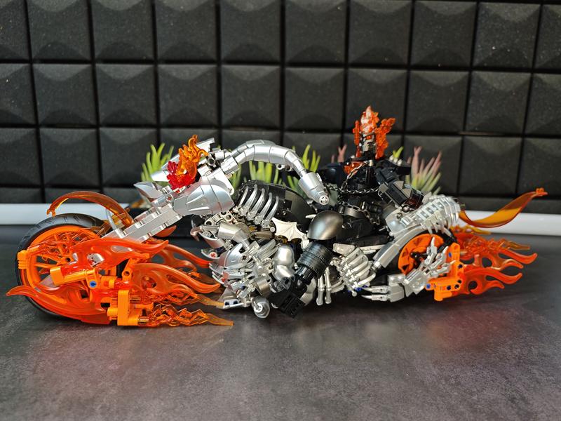 Собранная, шикарная, игровая модель Lego (совместимый набор) Призрачный Гонщик на детализированном байке. Фигурка полностью подвижная, в комплекте есть инструкция, коробка транспортировочная Размер модели : 52 см, 21 см, 23 см
