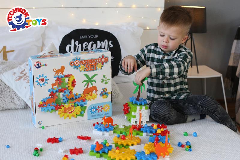 Конструктор с шестернями «ТехноК» дарит детям двойную радость. 118 ярких деталей из качественной пластмассы значительно разнообразят процесс сборки конструктора и увлекательные игры с ним. После того, как ребенок объединит шестерни, пластины-пазлы, фигурки зверей, пальмы и другие элементы конструктора, он получит захватывающую конструкцию, которой очень интересно играть. Этот конструктор является не только интересным, но и полезным: прокручивая шестерни, ребенок заставляет двигаться игрушечных зверей и изучает при этом отдельные физические явления и законы механики. Кроме того, игрушка знакомит детей с фауной и флорой: фигурки слона, верблюда, обезьяны, крокодила, льва и кенгуру входят в комплект конструктора. Все детали конструктора изготовлены из качественной пластмассы, без запаха и вредных составляющих. Продается игрушка в красивой коробке. Такой вариант упаковки отличный выбор для подарка.