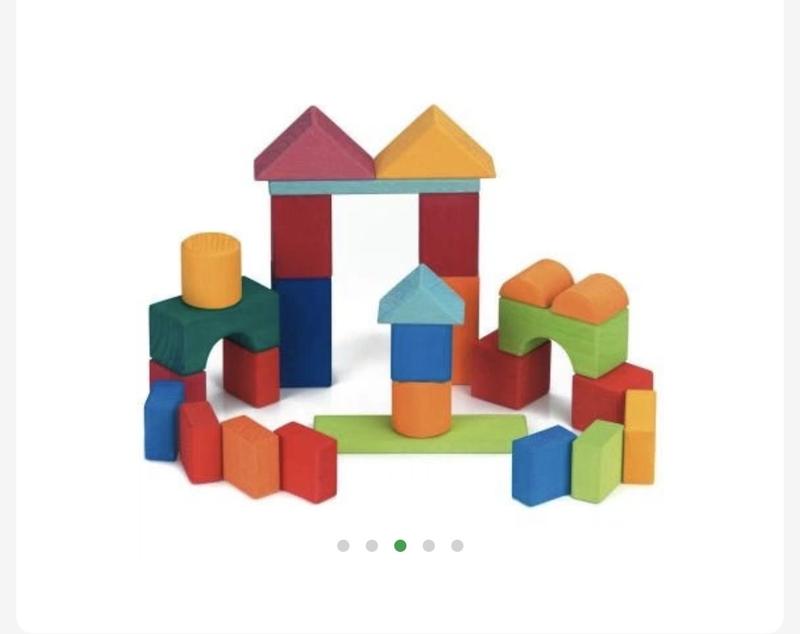 Усі 27 деталей зав'язані у текстильну сітку, яку можна використовувати для зручного зберігання набору або інших іграшок. Матеріал, з якого вироблений комплект – натуральне дерево, вкрите матовими фарбами на водній основі. Краски чудово підкреслюють малюнок дерева на сторонах брусків. Деталі невеликі, легкі, вони приємні на дотик і якісно оброблені.