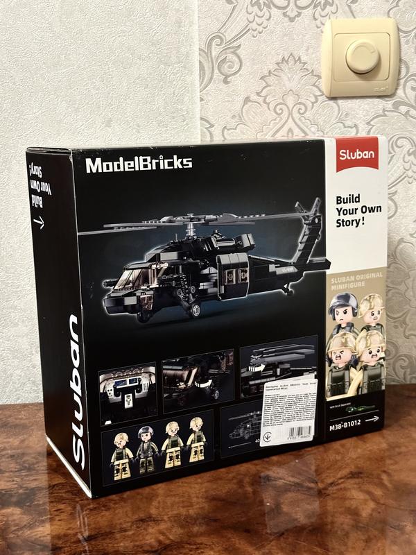 Конструктор Sluban Model Bricks Чорний яструб 692 деталі (M38-B1012) Конструктор містить 692 деталі, за допомогою яких Ви отримаєте вишукану фігуру справжнього вертольота. Вертоліт Чорний яструб чудово доповнить інтер'єр кімнати та займе своє місце у справжнього поціновувача авіаційної тематики. Довжина такого вертольота 40,8 см! У комплект входять 4 фігурки льотчиків, що робить гру більш занурювальною та цікавою. Кількість деталей: 692 Вік: від 8 років. Розмір упаковки 30-28-14,5 см