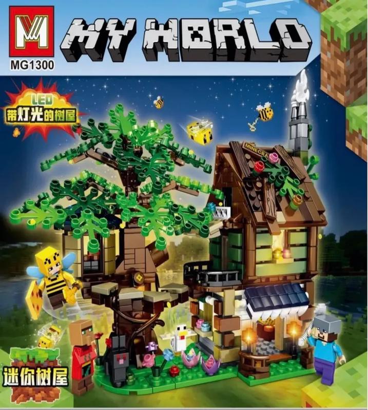 Конструктор Minecraft Домик на дереве MG1300 - перед заказом, пожалуйста, уточняйте наличие (оптовый состав). Создайте волшебный уголок Minecraft с набором «Дом пчелиная роща на дереве»! Этот уникальный конструктор сочетает в себе уютное жилище на дереве, подсветку LED и множество игровых деталей. Постройте дом с террасой, наблюдайте за пчелами и защищайте деревню вместе со Стивом и жителем. Главной фишкой набора является встроенная LED-подсветка, создающая горящий эффект огня и света в доме. В наборе вы найдете: Детализированное дерево с зеленой кроной и круговыми лестницей Двухэтажный дом на дереве с каминной трубой, террасой, окнами и ганком. Внутренний интерьер: уютные комнаты с мебелью и аксессуарами Фигурки персонажей: Стив, Житель, Пчеляр — для игр и приключений Фигурки животных: утка, кролик, пчели Декоративные элементы: цветы, растения и другие игровые предметы 830 деталей для сборки Особенности набора: Режим день/ночь благодаря встроенному LED-подсветке Игровые возможности: приключения с пчелами и защита деревни Развивает воображение, мелкую моторику и внимание к деталям Вдохновленный визуальным стилем игры Minecraft Подходит как для одиночной игры, так и в компании друзей Каждая деталь изготовлена из высококачественного ABS пластика, обеспечивая безопасность и прочное соединение. Собранная модель совместима со всеми конструкторами Lego и аналогами и может быть интегрирована в другие игровые сюжеты. Характеристики набора: Количество деталей: 830 Размер собранной конструкции: 23,6 х 19,8 х 14,1 см Міні-фігурки у комплекті Рекомендуемый возраст: 6+ Подробная пошаговая инструкция Набор представлен в оригинальной красочной коробке. Размер коробки: 44×6,8×41 см