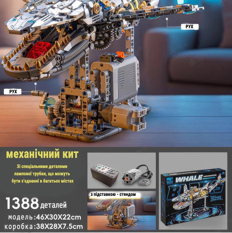 🔧 Механічний Кит -- вражаючий пластиковий конструктор з рухомими частинами! 🧩 Особливості конструктора: - Кількість деталей: 1388 штук високоякісного пластику. - Рухомі частини: завдяки вбудованому механізму та шестерням, частини кита обертаються. - З світлом з обох боків - Двигун з батареєю: забезпечує обертання та імітацію руху. - Універсальна підставка - стенд - Розмір готової моделі: 📏 Довжина -- 46 см 📏 Висота -- 30 см (разом із підставкою) 📏 Ширина -- 22 см ⚙️ Ідеальний варіант для подарунка, колекції або захопливого дозвілля. 📦 У комплекті: - Усі деталі конструктора - Двигун і елементи живлення - Інструкція зі зборки 🚀 Замовляйте та створюйте власний шедевр технічного мистецтва вже сьогодні!