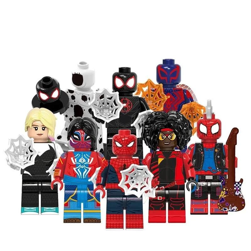 В комплект входят 8 сборных мини-фигурок разных версий Человека-паука и их союзников/врагов: - Персонажи: Человек-паук 2099 (Spider-Man 2099), Гвен Стейси (Gwen Stacy / Ghost-Spider), Майлз Моралес (Miles Morales), Пятно (Spot), Джессика Дрю (Jessica Drew), Индийский Человек-паук (Spider-Man India), Японский Человек-паук (Toei Spider-Man) и Паук-панк (Spider-Punk). - Материал: Фигурки изготовлены из безопасного и прочного высококачественного АБС-пластика (ABS-пластик). Материал нетоксичный и долговечный. - Размер: Стандартная высота фигурок составляет около 4,5 см. - Совместимость: Они полностью совместимы с оригинальными конструкторами LEGO и другими брендами, выпускающими блоки аналогичного размера. - Аксессуары: Каждая мини-фигурка (кроме Пятна) поставляется с аксессуарами, такими как паутина, сменные прически или оружие. Это качественные аналоги, предназначенные для коллекционирования, игры и развития воображения.