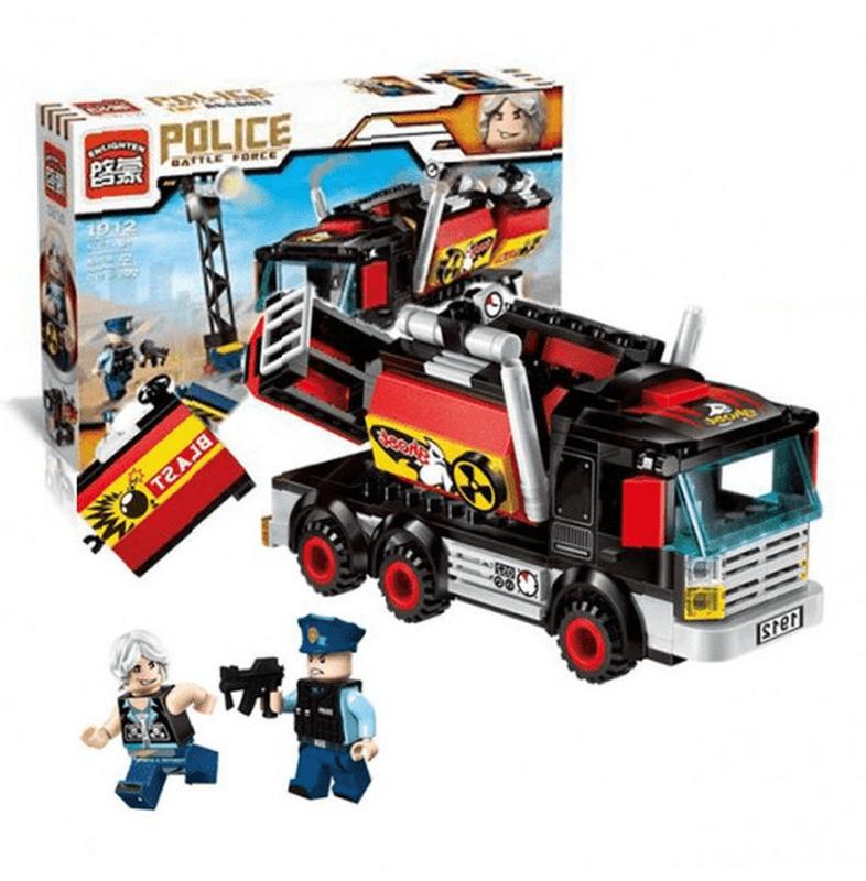 Полицейский набор конструктора, из которого можно собрать крутой грузовик с разными радиоактивными веществами и взрывными предметами, в то время как сам грузовик покрыт разными предупреждающими надписями. Один из лего человечков - преступник, решивший украсть чемодан с радиоактивными веществами, а лего полицейский должен этому помешать. Купить конструктор Police Battle force The assault можно в нашем интернет- магазине детских игрушек "Плюшево".